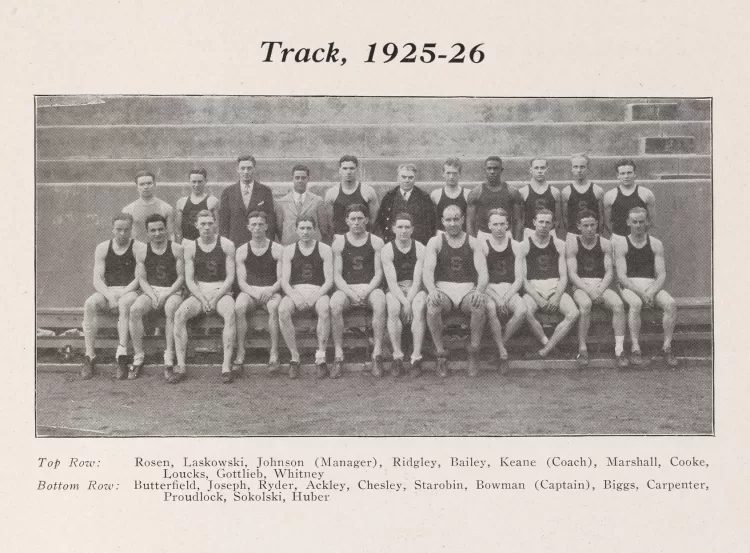 At age 15, he established a new world record of 2 and 3/5 seconds in the 20-yard dash in a meet at the YMCA in 1920. He starred in the dash on the Hartford High School track team, and was captain of the track team for two years. Joseph was a member of the school’s mile relay team that won the event at the Penn Relays, the country’s oldest track and field event, establishing a meet record. He was the first student to win the prize offered at the Hartford High School for achievement in athletic and scholastic activities. At Syracuse, he continued his career as a sprint star, setting a Syracuse record in the 60-yard dash in 1925.